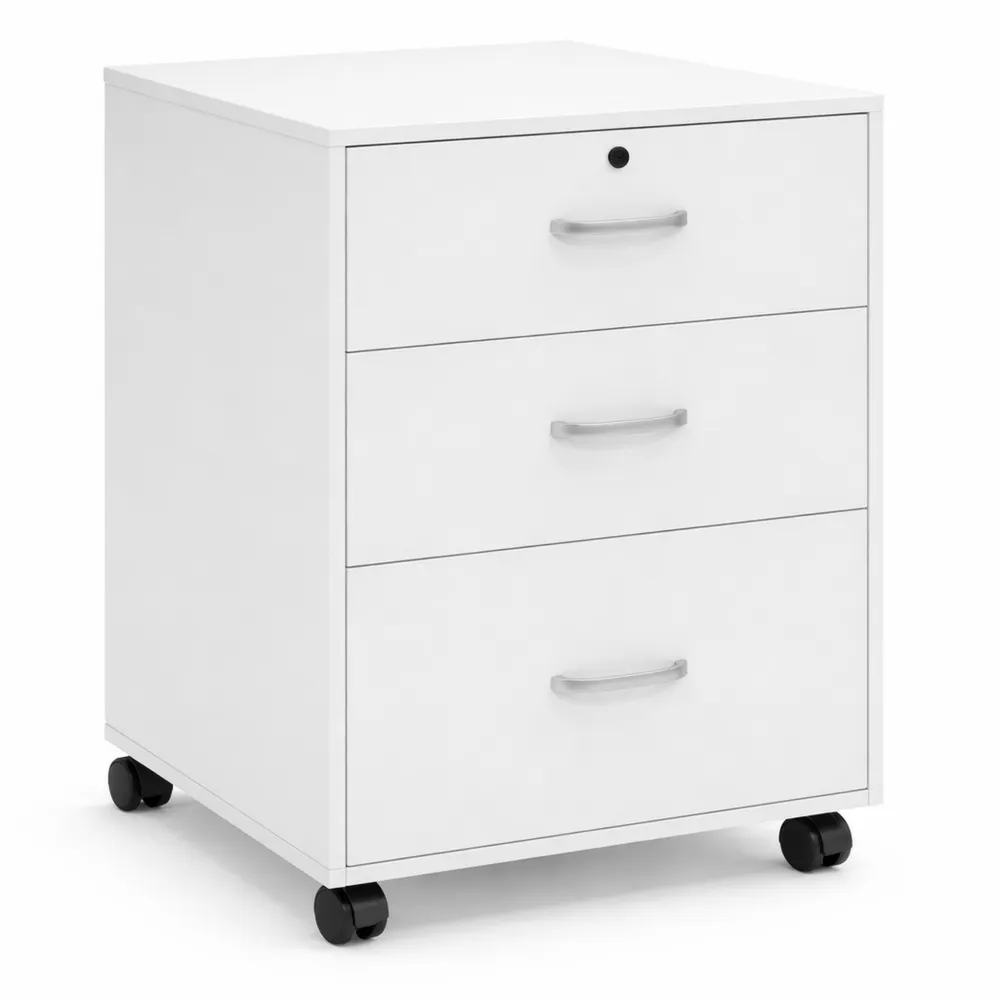 Rollcontainer mit drei Schubladen bietet Platz für Briefpapier und Hängeregister im A4-Format. Der Container kann flexibel im Raum platziert werden, um den Arbeitsbereich zu optimieren. Hergestellt aus robusten Spanplatten, bieten die Schubladen ruhiges Öffnen und Schließen. Der Rollcontainer fügt sich in vorhandene Büromöbel ein. Leicht zu bewegen und zu reinigen.