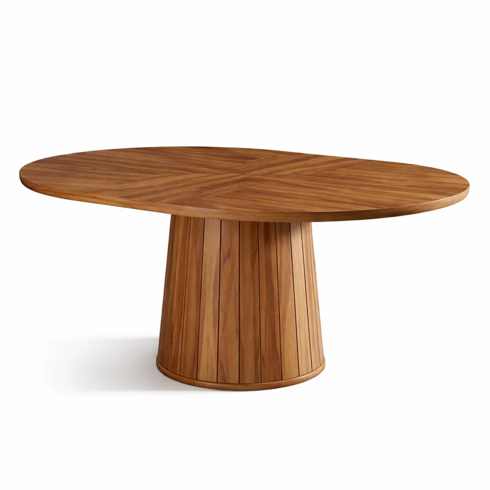 Der ovale Esstisch bietet Platz für bis zu 6 Personen und schafft eine angenehme Atmosphäre für gemeinsame Mahlzeiten. Die robuste Holzplatte zusammen mit dem Metallfuß sorgt für Stabilität und Beständigkeit. Die natürliche Holzmaserung und das schlichte Design fügen sich harmonisch in unterschiedliche Einrichtungsstile ein. Die ovale Form fördert angenehme Gespräche und passt sich Platzverhältnissen effizient an.