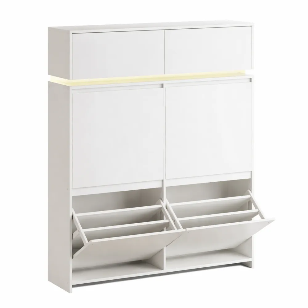 Dieser schmale Schuhschrank mit den Maßen 100 x 24 x 119 cm bietet Platz für 16–20 Paar Schuhe. Er enthält zwei obere Schubladen für kleine Alltagsgegenstände und eignet sich für Eingangsbereiche, Flure und Korridore. Die LED-Beleuchtung verfügt über 25 Farben, 10 Helligkeitsstufen und mehrere Modi, um die Wohnatmosphäre zu gestalten. Der weiße Schuhschrank besteht aus vier doppelstöckigen Schubladen mit verstellbaren Regalböden für flache Schuhe, Sneakers und Stiefel. Das Design ist modern und schlicht mit einem weißen Korpus und unsichtbaren Griffen. Der Schuhschrank besteht aus Spanplatte mit einer Tragkraft von 80 kg und ist stabil. Doppelschubladen bieten praktische Aufbewahrung für Schlüssel und andere kleine Gegenstände. Die doppellagige Schuhablage ermöglicht übersichtliche Aufbewahrung und erhöhte Kapazität. Ein integrierter Dämpfungsstopper sorgt für sanftes Öffnen und Schließen. Spikes verhindern Kratzer auf dem Boden.